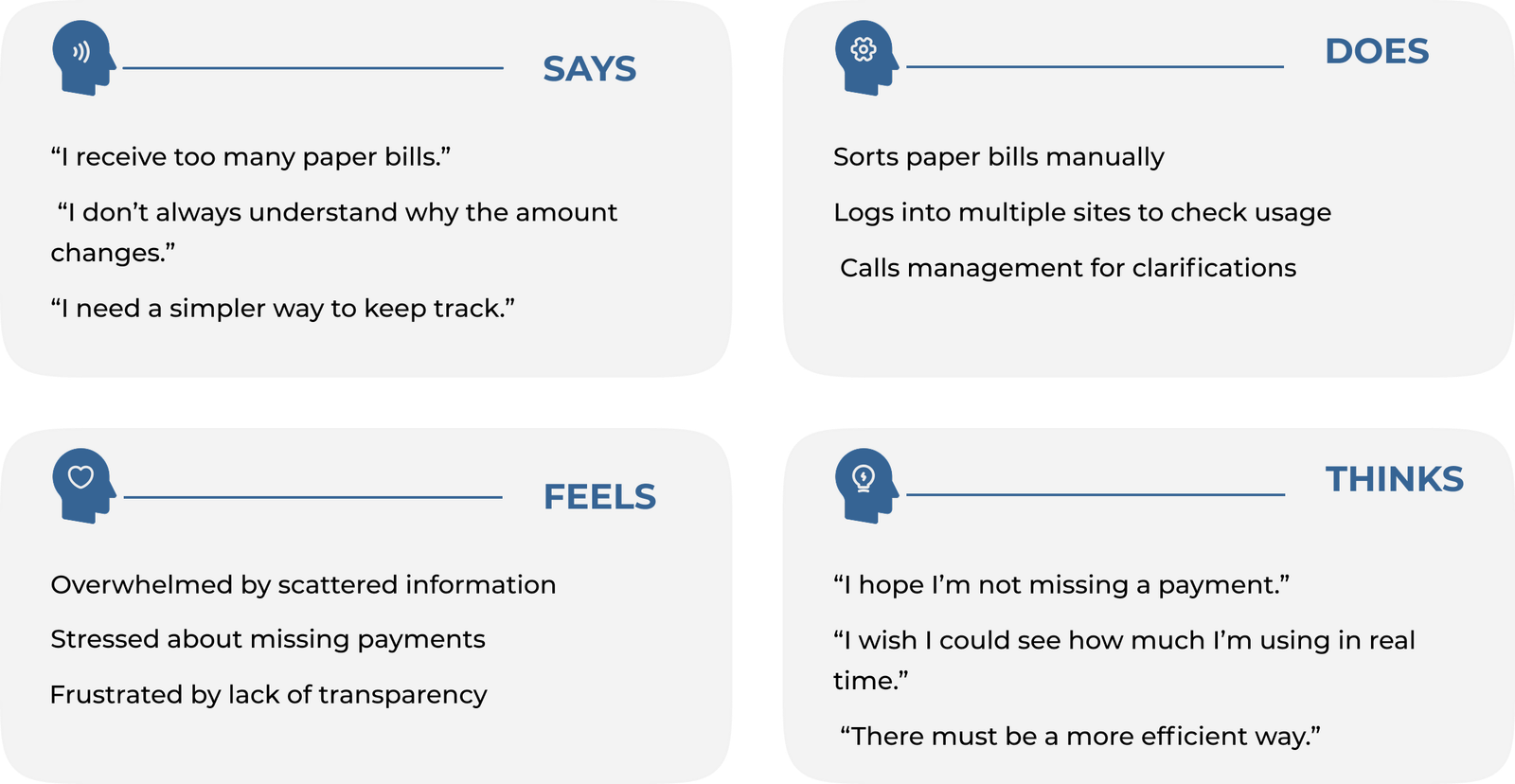 The empathy map helped translate interview insights into a deeper understanding of users’ behaviors, concerns, and motivations when managing their bills. It highlighted pain points around tracking payments, understanding usage, and dealing with scattered information.