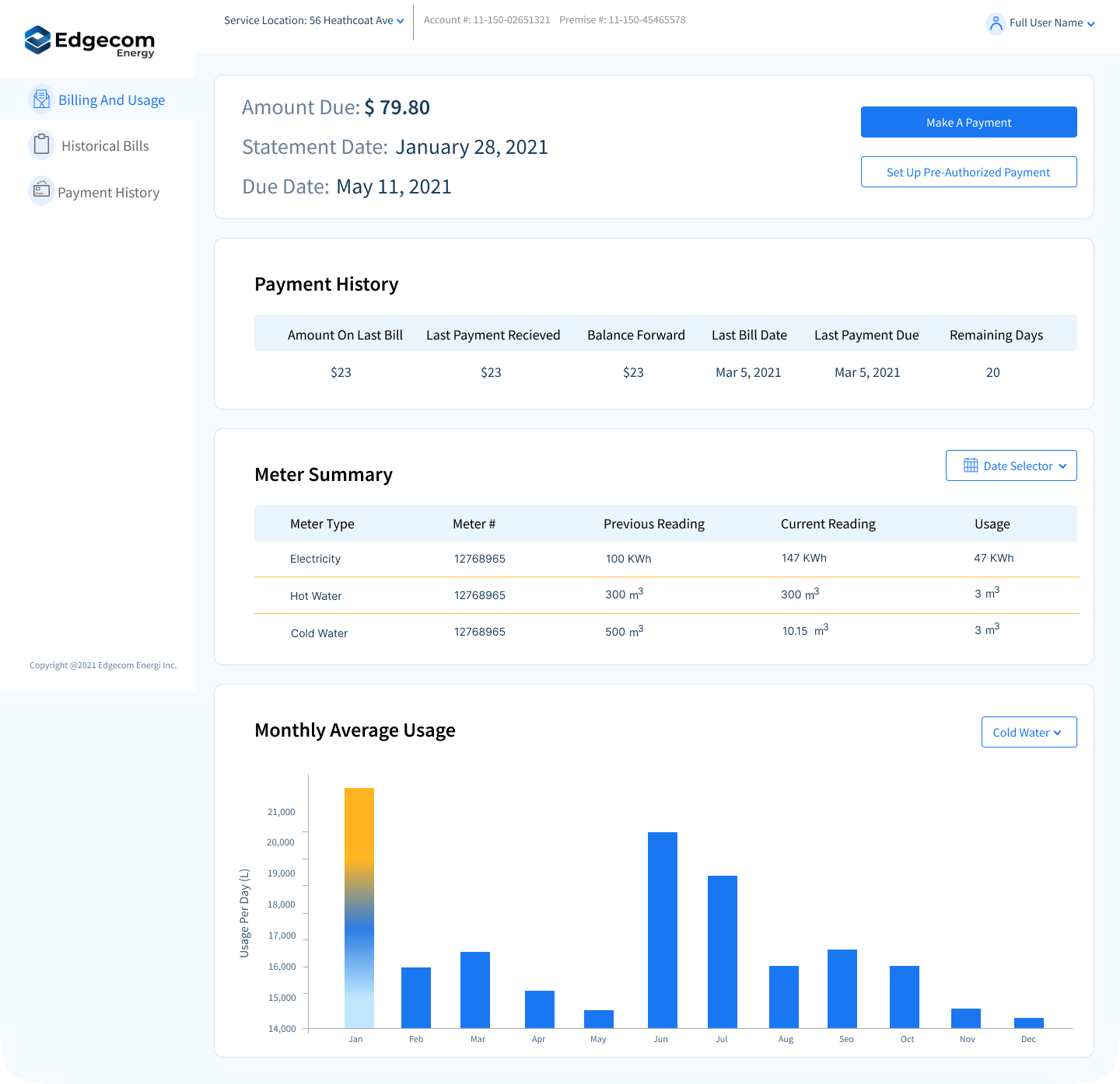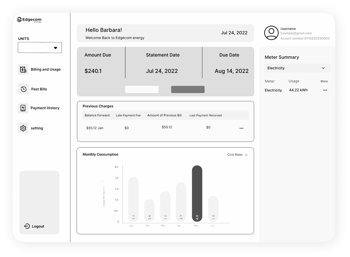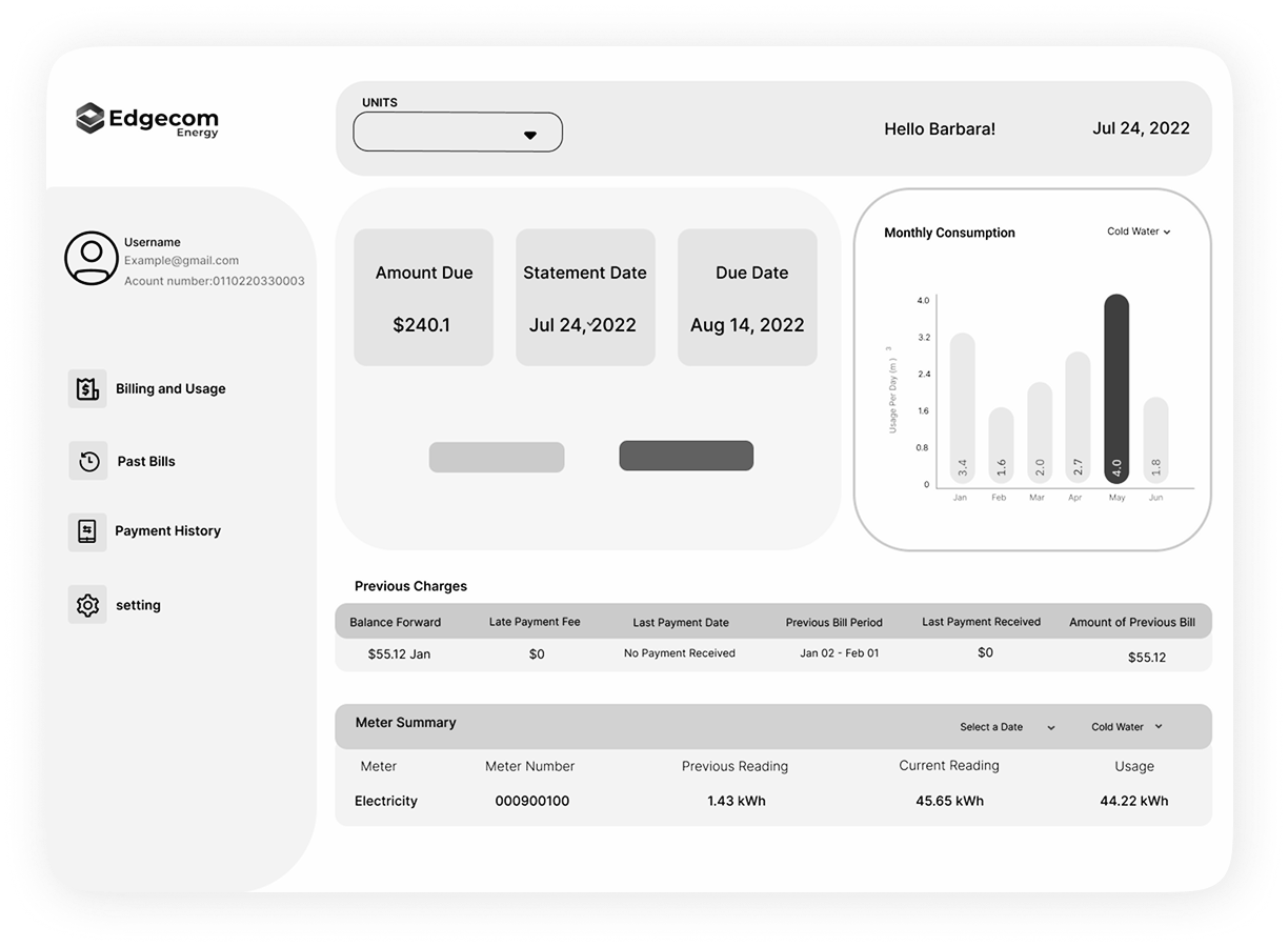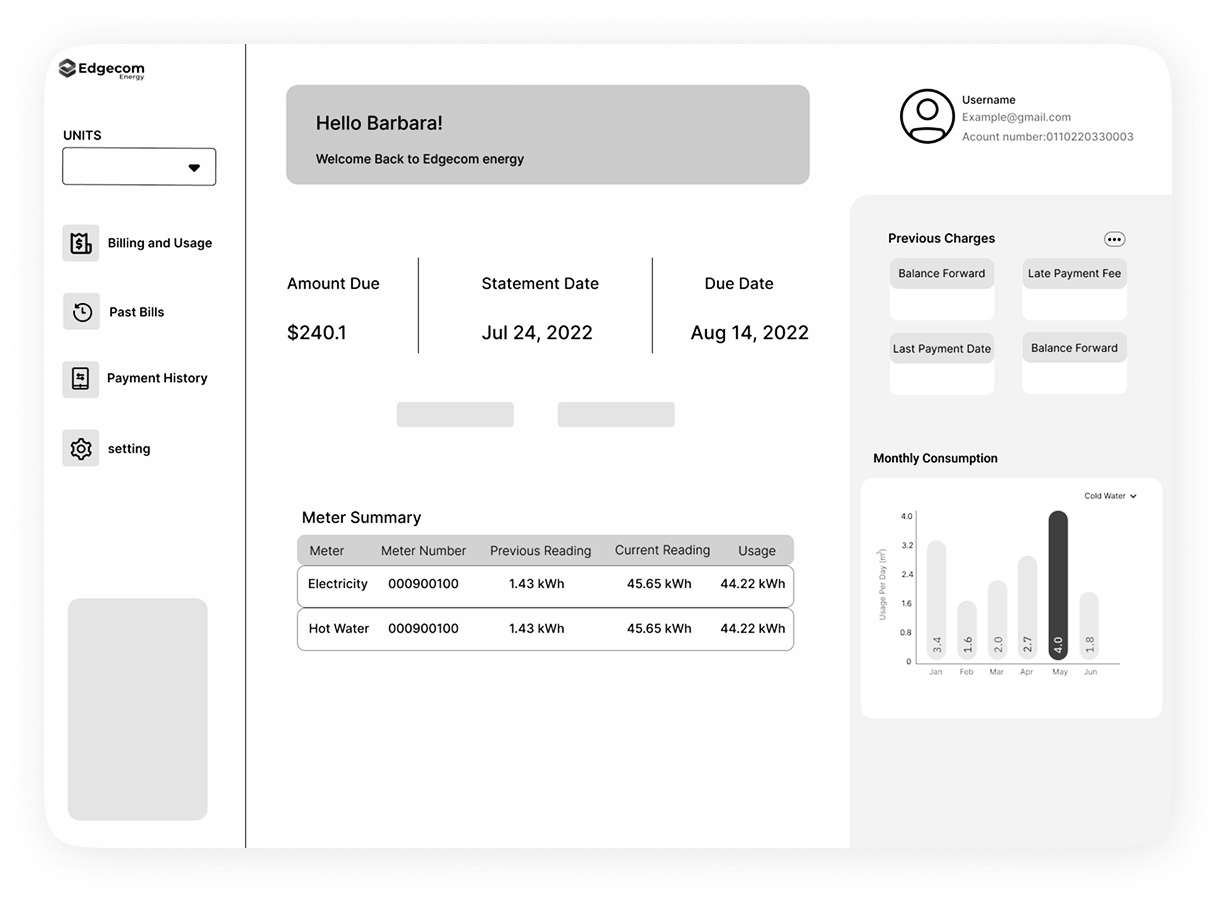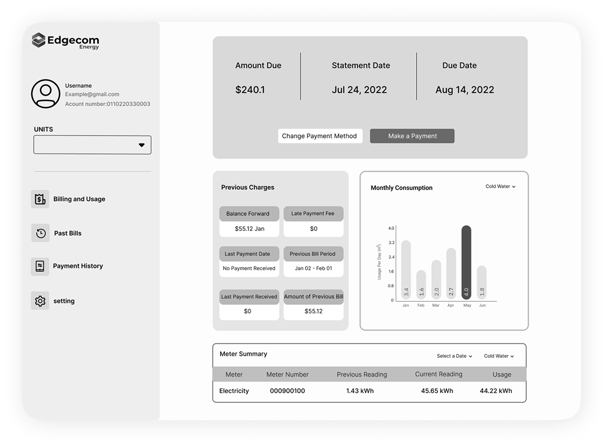 We designed a digital billing dashboard that allows residents to view real-time utility usage, track trends over time, compare consumption across periods, and pay bills through a simple and secure interface. The system reduces manual tracking, improves transparency, and supports more informed decision-making.