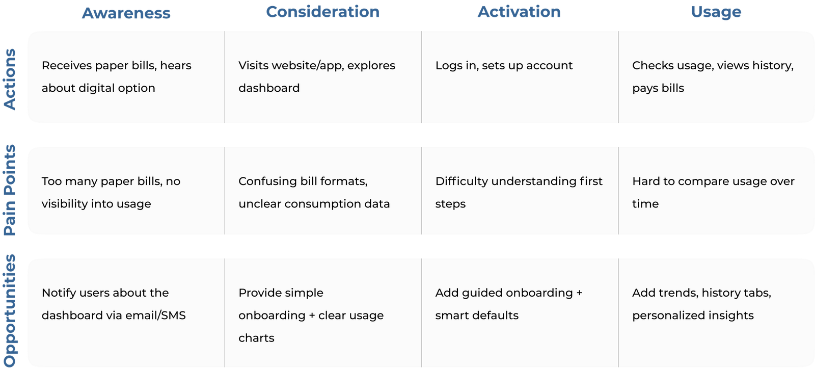 The user journey map highlights the key steps residents take when managing their bills and reveals the pain points where a digital dashboard can create meaningful improvements.